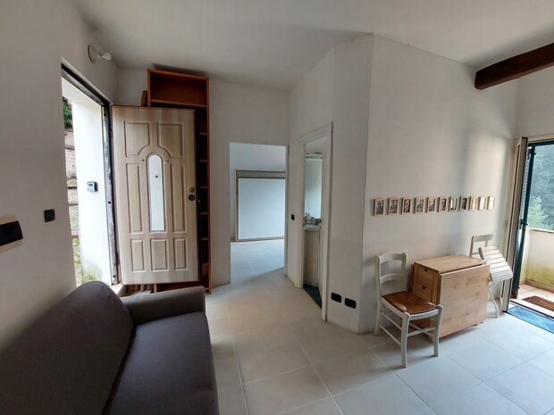 Dall'accogliente giardino pavimentato si accede a un luminoso salone con caratteristico camino, perfetto per momenti di convivialità. Completa il piano un pratico cucinotto con affaccio su una corte esterna di proprietà e un comodo bagno di servizio.